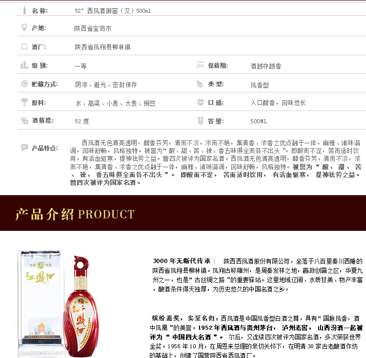 酒博城 西凤 52度西凤酒御窖(汉) 凤香型白酒 古老四大名酒 500ml