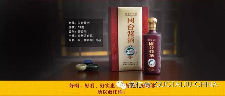 还是那瓶好酒,更多人的享受......1、金国台酒生命不息、奋斗不止;千淘万漉虽辛苦,大浪淘沙始见金;对品质孜孜以求,千锤百炼、金浆玉醴终以横空出世。金品酱香,滴酒如金、珍贵非凡。得茅台镇酱酒核心产区之地利,承传统酱酒酿造工艺之精粹,酱酒名师精心勾调而成酱香突出、丰满醇和的珍贵佳酿。传统的富贵与现代的时尚结合而成炫彩金色,展现酱香国台的尊贵与荣誉。品金国台酒,享精彩人生。(品名:金国台; 规格:500ml; 酒精度:53%; 香型:酱香型;扫码价:298元/瓶)(品名:金国台;规格:500ml; 酒精度:46%; 香型:酱香型;扫码价:258元/瓶)(品名:金国台; 规格:300ml; 酒精度:53%; 香型:酱香型;扫码价:198元/瓶)2、银国台酒优雅于心、优越于形。坚守自我的美丽和升华是银的一种内在涵养,以一颗平静的心聆听自己心灵之声,看花开花落、云卷云舒,于精致优雅之中品读一种对坚守、对精益求精的执着。银制酱香,优雅芬芳,卓越品质。茅台镇传统酿造之法与现代科技完美结合,缔造优雅细腻、回味悠长的健康佳酿。沉稳内敛的时尚银彰显酱香高贵风采,清新雅致中尽显低调风华。久久的情谊,尽在银国台酒。(品名:银国台; 规格:500ml; 酒精度:53%; 香型:酱香型;扫码价:238元/瓶)(品名:银国台; 规格:500ml; 酒精度:46%; 香型:酱香型;扫码价:188元/瓶)3、红国台酒红火喜庆于形,勤勉朴实于心。红红火火演绎人生激情时刻,兢兢业业注解生命勤勉旅程。于热情奔放之中品读生命的传承不息、奋斗不止;于祥和坚韧之中谱写一种对勤勉朴实的吟唱。红运酱香,运通四海,通达五洲。每一瓶皆经过9次蒸煮、8次发酵、7次取酒,经长期储存、精心勾调而成诸味协调、空杯留香的精品佳酿。富丽的中国红吉庆喜气,闪耀着灿烂炫目的祥瑞之光,传递着美好的祝福。红火新生活,醉美红国台。(品名:红国台; 规格:500ml; 酒精度:53%; 香型:酱香型;扫码价:198元/瓶)(注:53度红国台-2014年中国国际酒业博览会年度最佳新品)关注:长按识别图中二维码